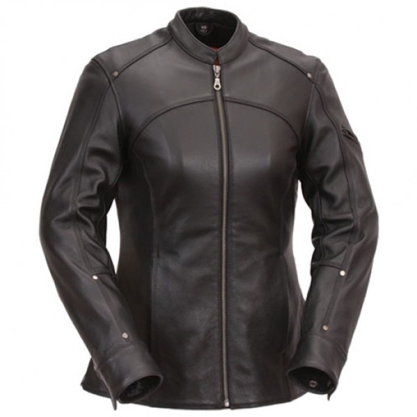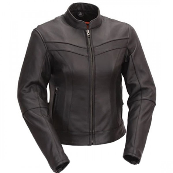 Women Black Leather Touring Motorcycle Jacket Soft Milled Cowhide 1.2-1.3mm. Scooter Collar with two outside hidden zippered pockets and one inside zippered pocket. Modern cut lines that accentuate female form with triple stitched details. Cool rivet decoration at shoulders and belt loops. All sizes available