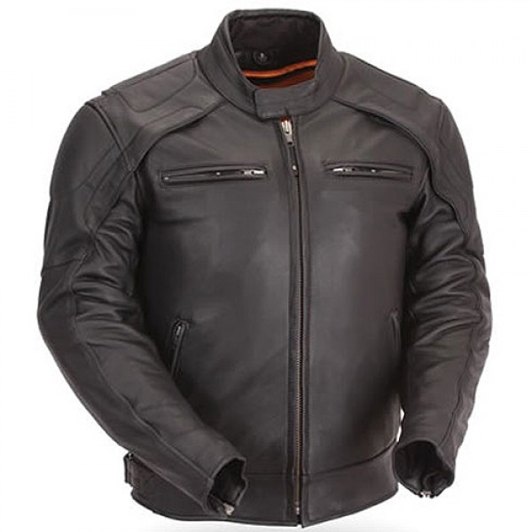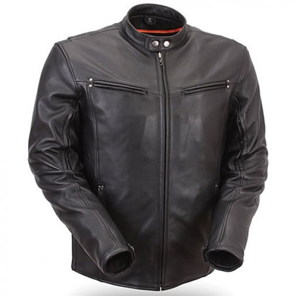 Men Black Leather Classic Motorcycle Jacket with Gun Metal Hardware Soft Cowhide 1.1-1.3mm. Gun metal hardware, epaulets & large lapels for updated MC look. Removable neck warmer for extra cold days. 2 Side set adjustable buckles avoid scratching the tank paint. 2 outside pockets, one inside pocket & oneticket book pocket for storage. Large back panel for patches. Action back with stretch panel in liner arms for comfort while riding. 2 chest & one full width rear vents with heavy mesh inner liner for full ventilation.